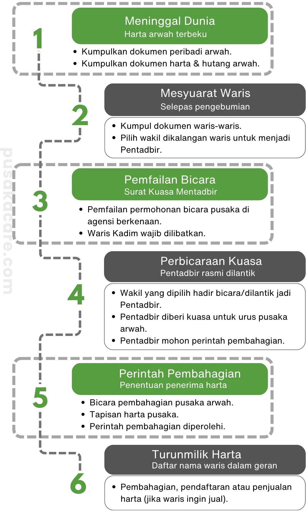 Matlamat prosedur pengurusan pusaka adalah untuk memastikan harta seseorang yang telah meninggal dunia diuruskan dan diagih secara adil, teratur, dan mengikut undang-undang yang ditetapkan (Syarak & Sivil). Aturan pengurusan pusaka secara ringkas adalah seperti berikut:
